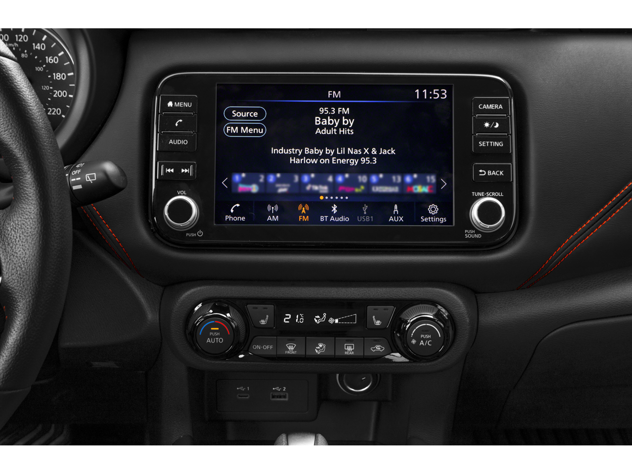 - Radio: AM/FM Audio System -inc: 8" color touchscreen display w/6 speakers, Bluetooth® hands-free phone system, streaming audio via Bluetooth®, Siri eyes free, audio and Bluetooth® steering wheel switches, 3 USB ports (1x front charge and data and 2x rear charge only), type C USB (data and charge) (front), NissanConnect featuring Apple CarPlay, Android Auto, SiriusXM satellite radio w/advanced audio features and hands-free text messaging assistant